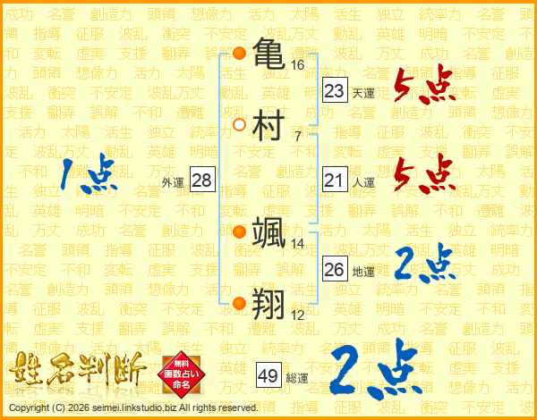 亀(16画)村(7画) 颯(14画)翔(12画)
