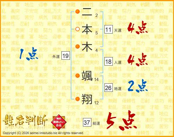 二(2画)本(5画)木(4画) 颯(14画)翔(12画)