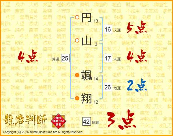 円(13画)山(3画) 颯(14画)翔(12画)