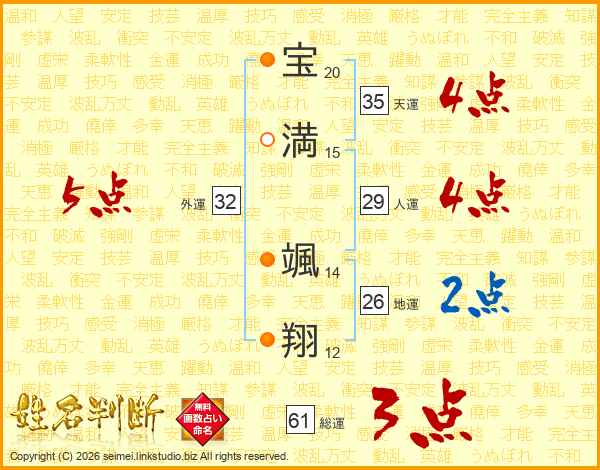 宝(20画)満(15画) 颯(14画)翔(12画)