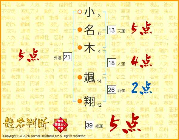小(3画)名(6画)木(4画) 颯(14画)翔(12画)