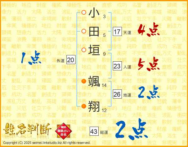 小(3画)田(5画)垣(9画) 颯(14画)翔(12画)