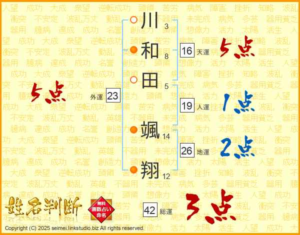 川(3画)和(8画)田(5画) 颯(14画)翔(12画)