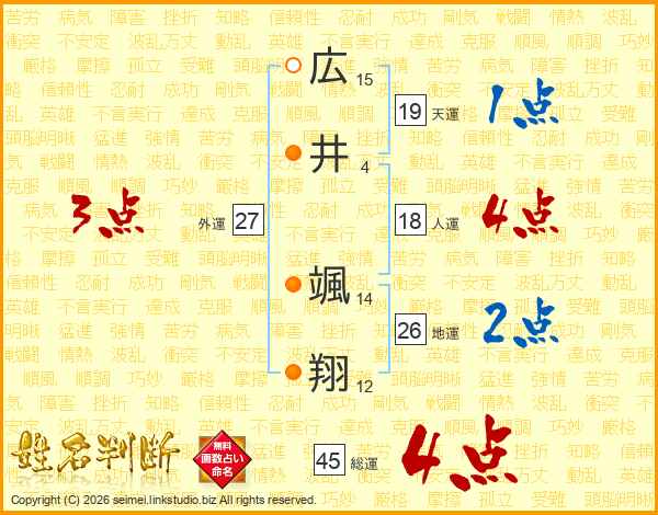 あなたの人生を表す1番重要な運勢です。生涯を通じて影響する総合運となり、主に50歳以降の晩年期に影響を及ぼします。苗字と名前の合計画数。