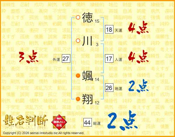 徳(15画)川(3画) 颯(14画)翔(12画)