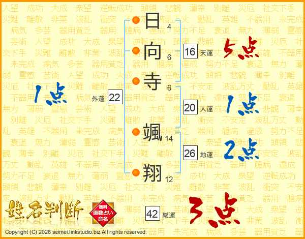 日(4画)向(6画)寺(6画) 颯(14画)翔(12画)