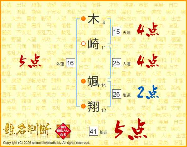 木(4画)崎(11画) 颯(14画)翔(12画)