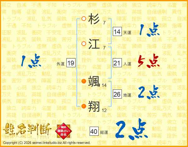 杉(7画)江(7画) 颯(14画)翔(12画)