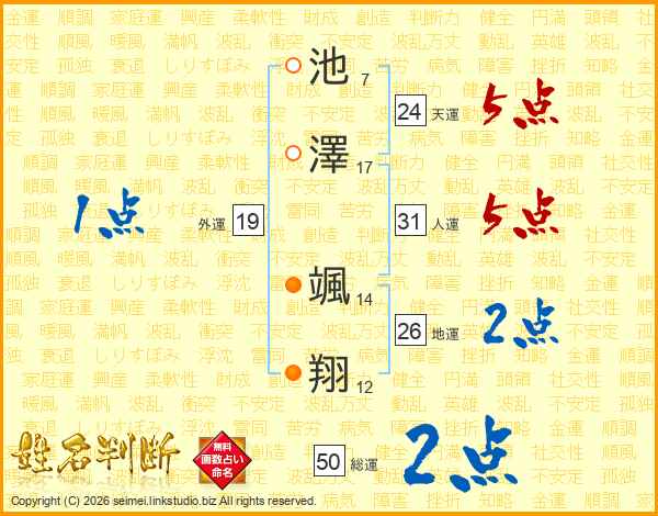 池(7画)澤(17画) 颯(14画)翔(12画)
