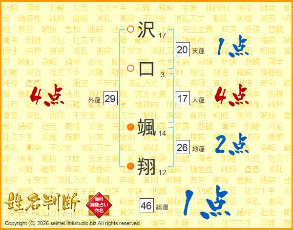 沢(17画)口(3画) 颯(14画)翔(12画)