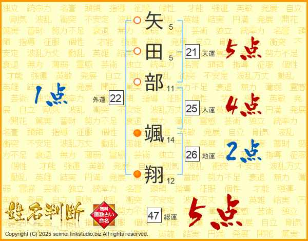 矢(5画)田(5画)部(11画) 颯(14画)翔(12画)