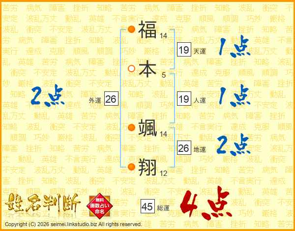 あなたの人生を表す1番重要な運勢です。生涯を通じて影響する総合運となり、主に50歳以降の晩年期に影響を及ぼします。苗字と名前の合計画数。