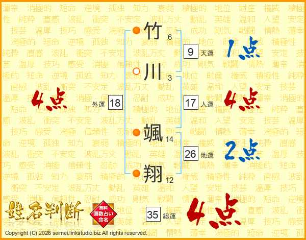 竹(6画)川(3画) 颯(14画)翔(12画)