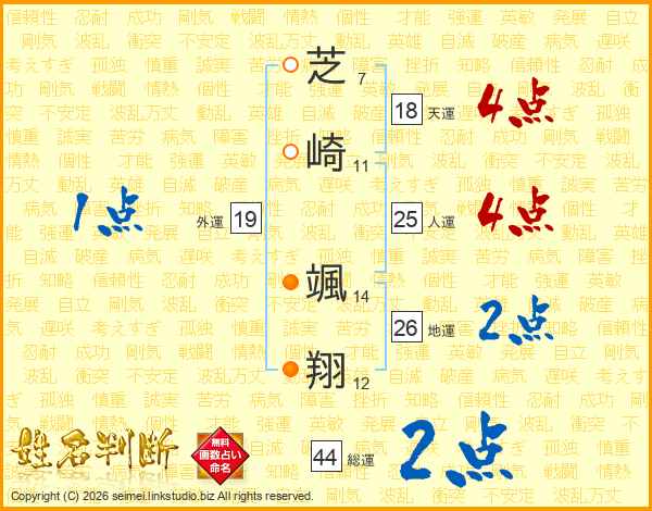 芝(7画)崎(11画) 颯(14画)翔(12画)