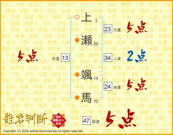 上(3画)瀬(20画) 颯(14画)馬(10画)