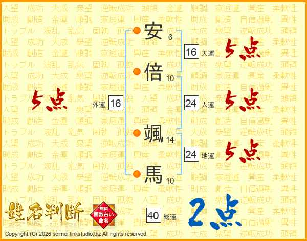 安(6画)倍(10画) 颯(14画)馬(10画)