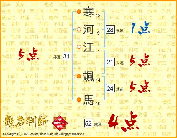 寒河江颯馬さんの総運は52画の4点!