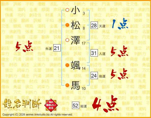 小(3画)松(8画)澤(17画) 颯(14画)馬(10画)