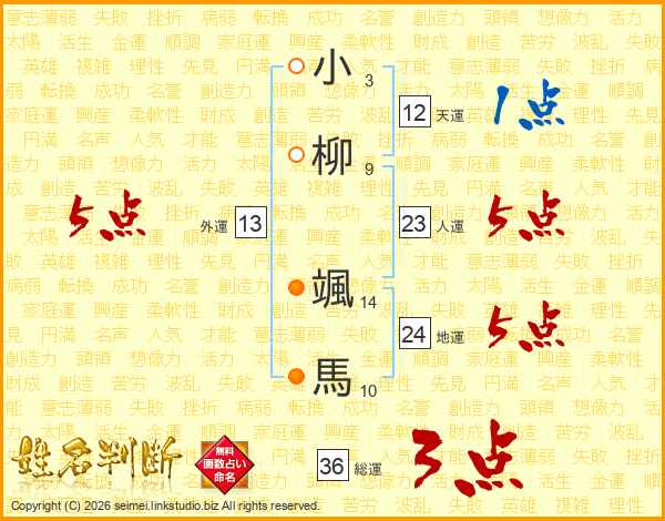 小(3画)柳(9画) 颯(14画)馬(10画)