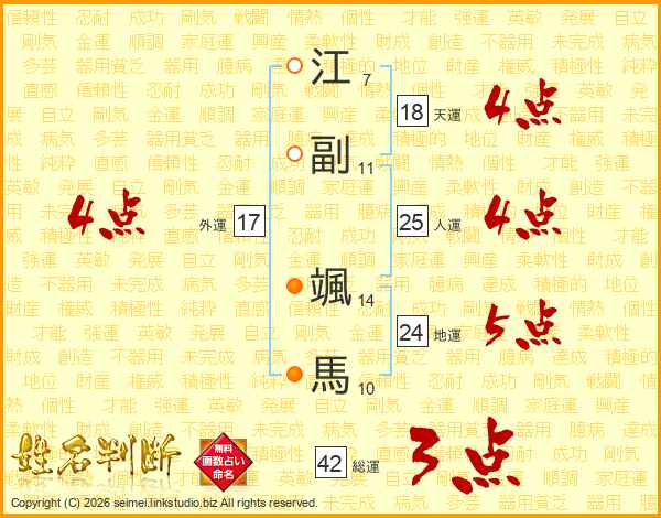 生活面を象徴する運勢です。外部から受ける影響力を表し、結婚運、家庭運や職場、環境への順応性を表します。総運から人運を引いた画数。姓や名が1文字の場合を除く。