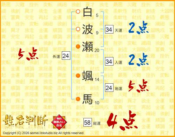 白(5画)波(9画)瀬(20画) 颯(14画)馬(10画)