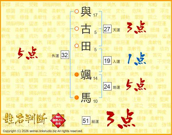 與(17画)古(5画)田(5画) 颯(14画)馬(10画)