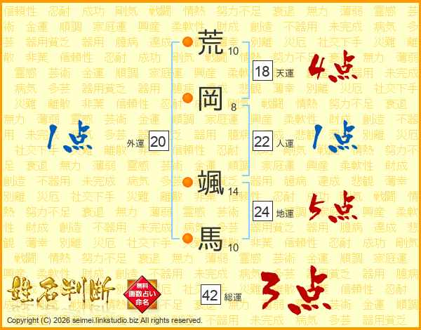 荒(10画)岡(8画) 颯(14画)馬(10画)