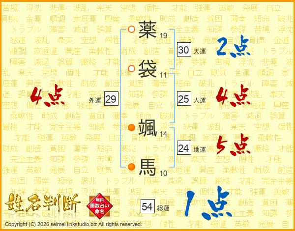 生活面を象徴する運勢です。外部から受ける影響力を表し、結婚運、家庭運や職場、環境への順応性を表します。総運から人運を引いた画数。姓や名が1文字の場合を除く。