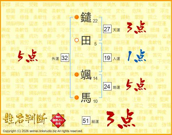 鑓田颯馬さんの外運は32画の5点!
