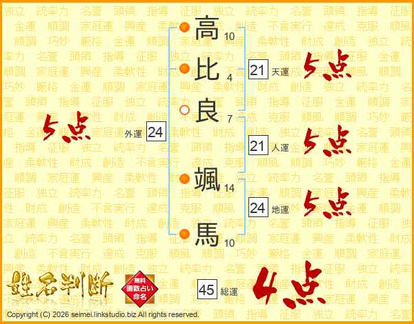 高(10画)比(4画)良(7画) 颯(14画)馬(10画)