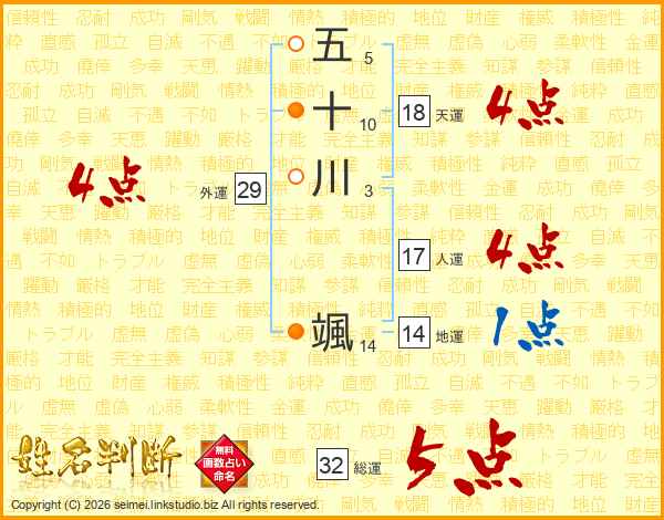 五十川颯さんの総運は32画の5点!