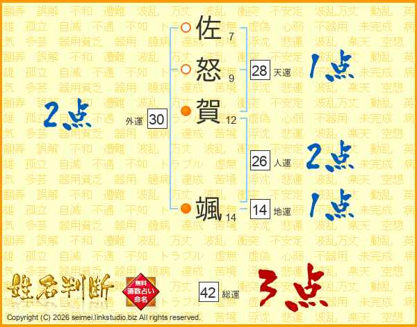 佐怒賀颯さんの総運は42画の3点!