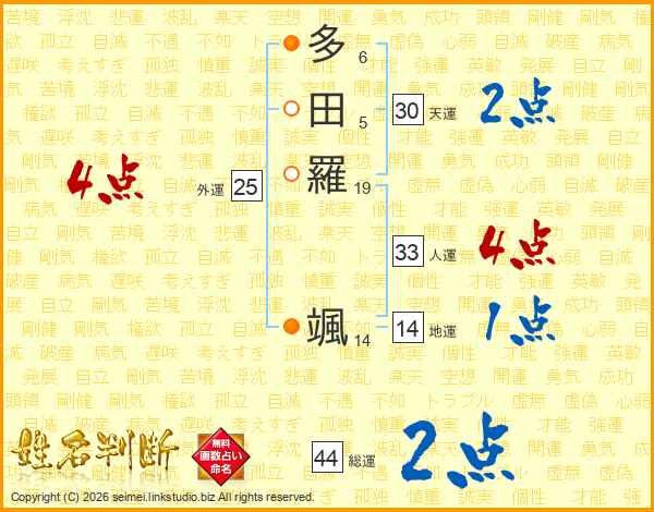 生活面を象徴する運勢です。外部から受ける影響力を表し、結婚運、家庭運や職場、環境への順応性を表します。総運から人運を引いた画数。姓や名が1文字の場合を除く。