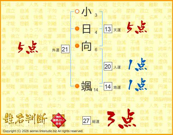 生活面を象徴する運勢です。外部から受ける影響力を表し、結婚運、家庭運や職場、環境への順応性を表します。総運から人運を引いた画数。姓や名が1文字の場合を除く。