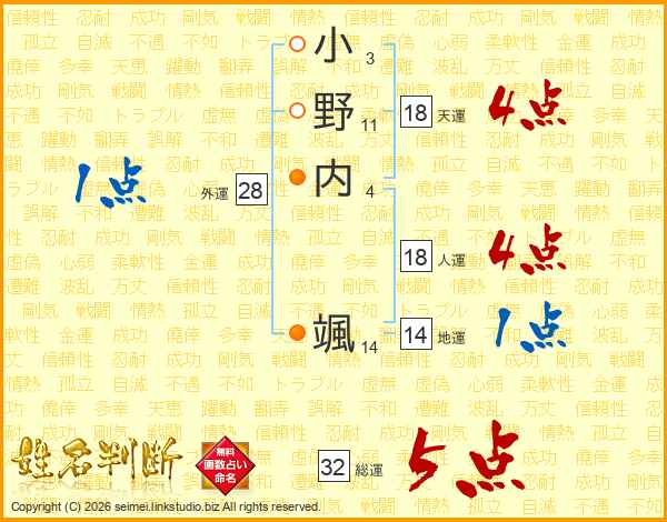生活面を象徴する運勢です。外部から受ける影響力を表し、結婚運、家庭運や職場、環境への順応性を表します。総運から人運を引いた画数。姓や名が1文字の場合を除く。