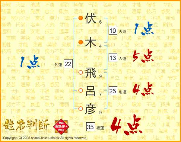 伏(6画)木(4画) 飛(9画)呂(7画)彦(9画)