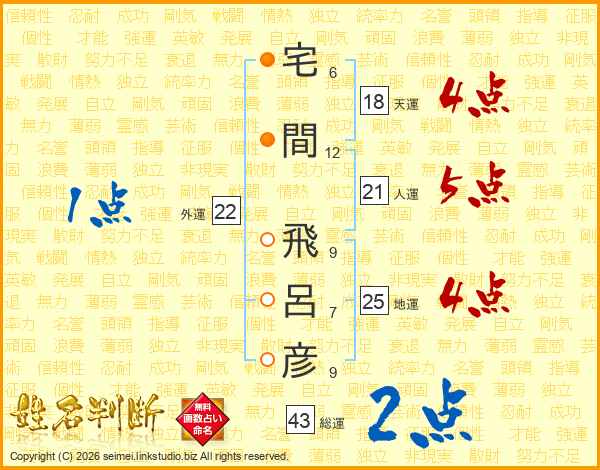 宅(6画)間(12画) 飛(9画)呂(7画)彦(9画)