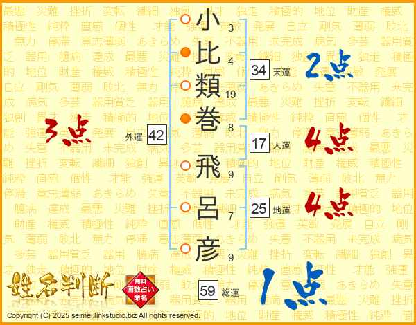 小(3画)比(4画)類(19画)巻(8画) 飛(9画)呂(7画)彦(9画)