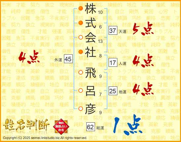 株(10画)式(6画)会(13画)社(8画) 飛(9画)呂(7画)彦(9画)