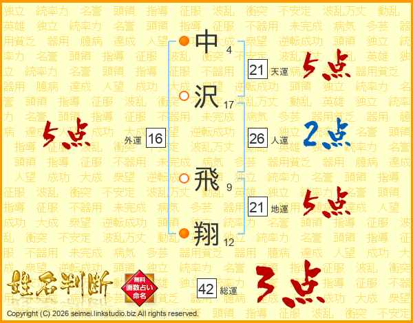 中(4画)沢(17画) 飛(9画)翔(12画)