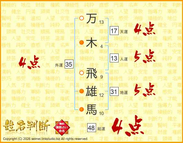 万(13画)木(4画) 飛(9画)雄(12画)馬(10画)