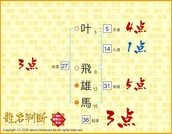 叶飛雄馬さんの総運は36画の3点!