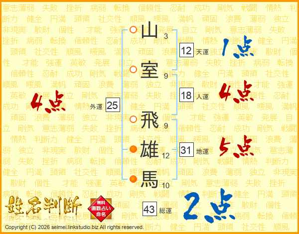 山(3画)室(9画) 飛(9画)雄(12画)馬(10画)