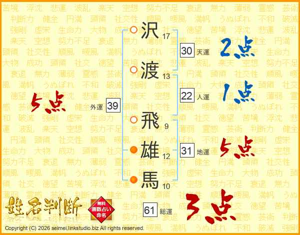 沢(17画)渡(13画) 飛(9画)雄(12画)馬(10画)