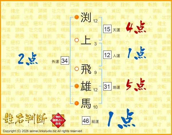 渕(12画)上(3画) 飛(9画)雄(12画)馬(10画)