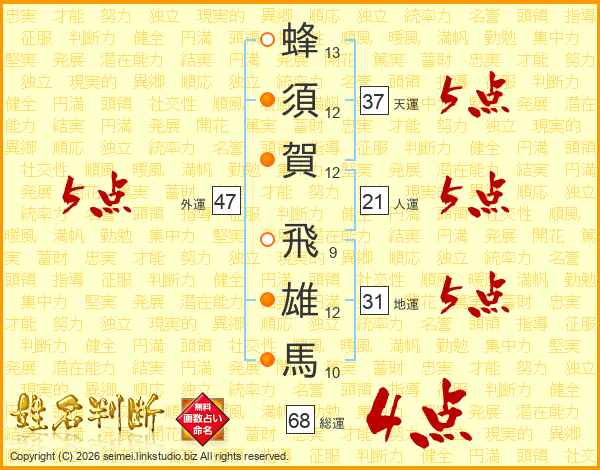 蜂須賀飛雄馬さんの外運は47画の5点!