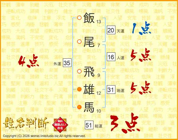 飯(13画)尾(7画) 飛(9画)雄(12画)馬(10画)
