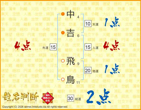 中(4画)吉(6画) 飛(9画)鳥(11画)