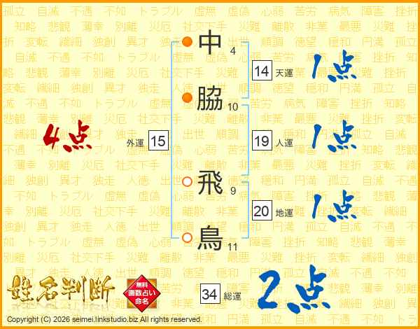 中(4画)脇(10画) 飛(9画)鳥(11画)