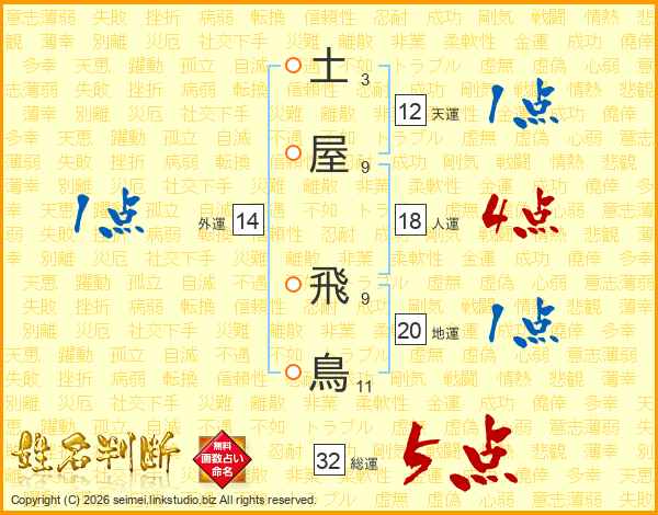 土(3画)屋(9画) 飛(9画)鳥(11画)